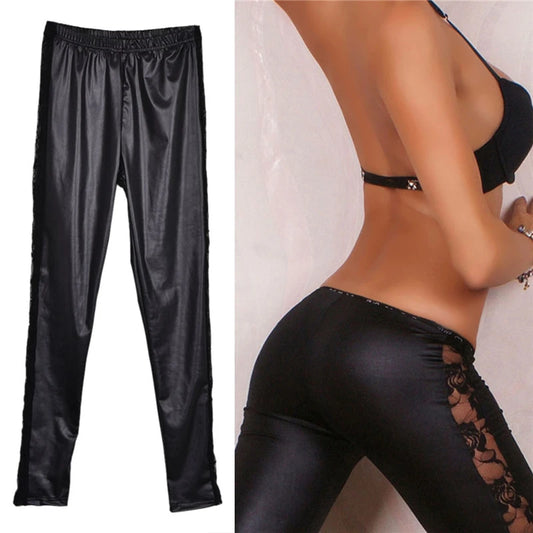 High Quality 1Pc black Sexy Splicing Lace Leather Slim Fit Leggings Skinny Stretch Pants Trousers high quality